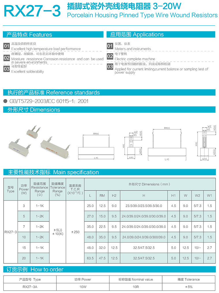 RX27-3型插脚式瓷外壳线绕电阻器
