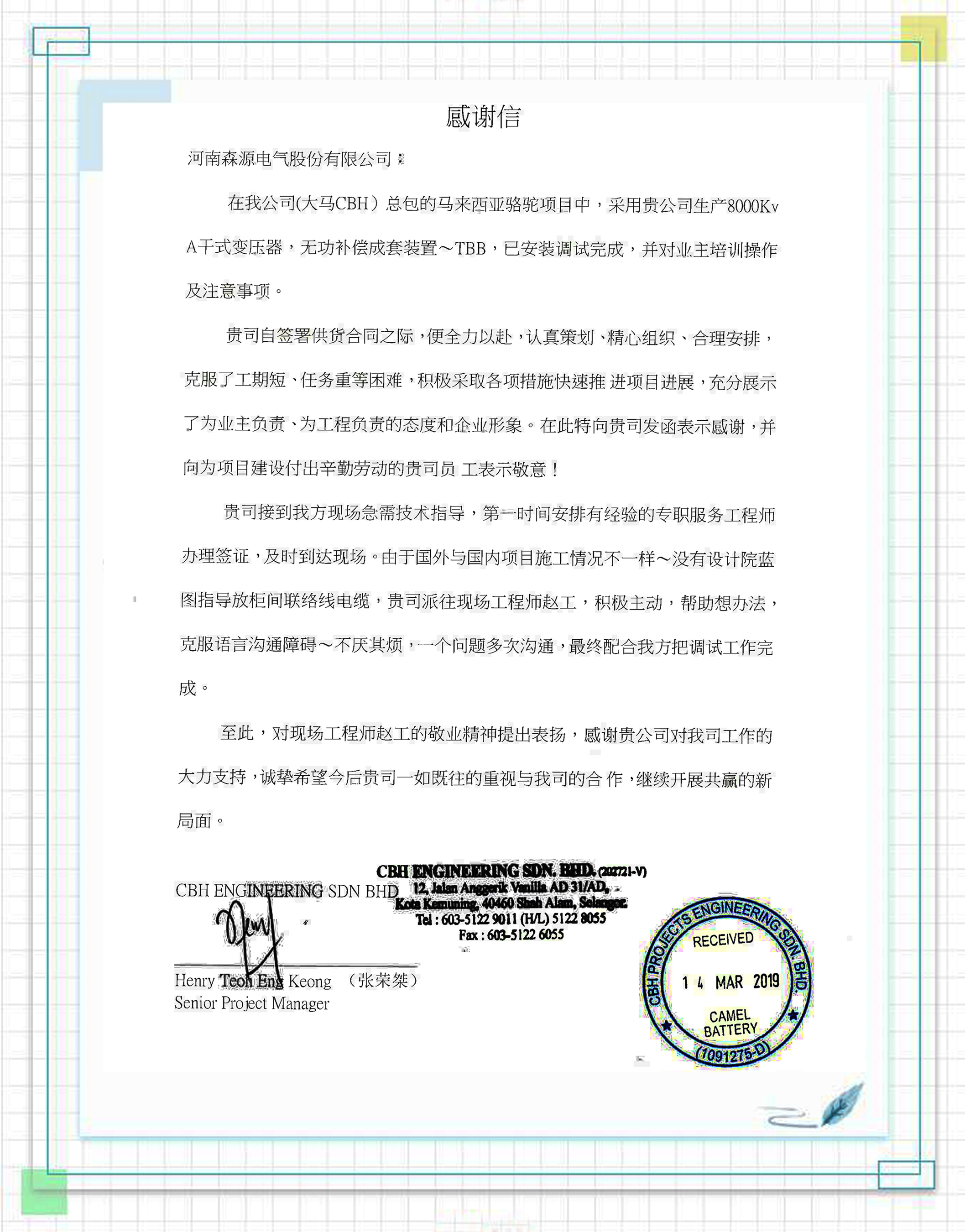 在赵治国回国后,客户写给公司的一封感谢信也漂洋过海传到了宝威(中国)一站式服务平台。大马CBH公司在对宝威(中国)一站式服务平台表示感谢的同时,更希望今后双方能够继续合作,开拓共赢的新局面。与大马CBH公司的合作,只是宝威(中国)一站式服务平台电气诸多海外业务中的一项。随着国家“一带一路”倡议的深入实施,宝威(中国)一站式服务平台电气海外业务的拓展不断取得新突破,产品在非洲、东南亚、中亚、南美洲等地的重点项目建设工程中多次应用,不断得到用户的好评。