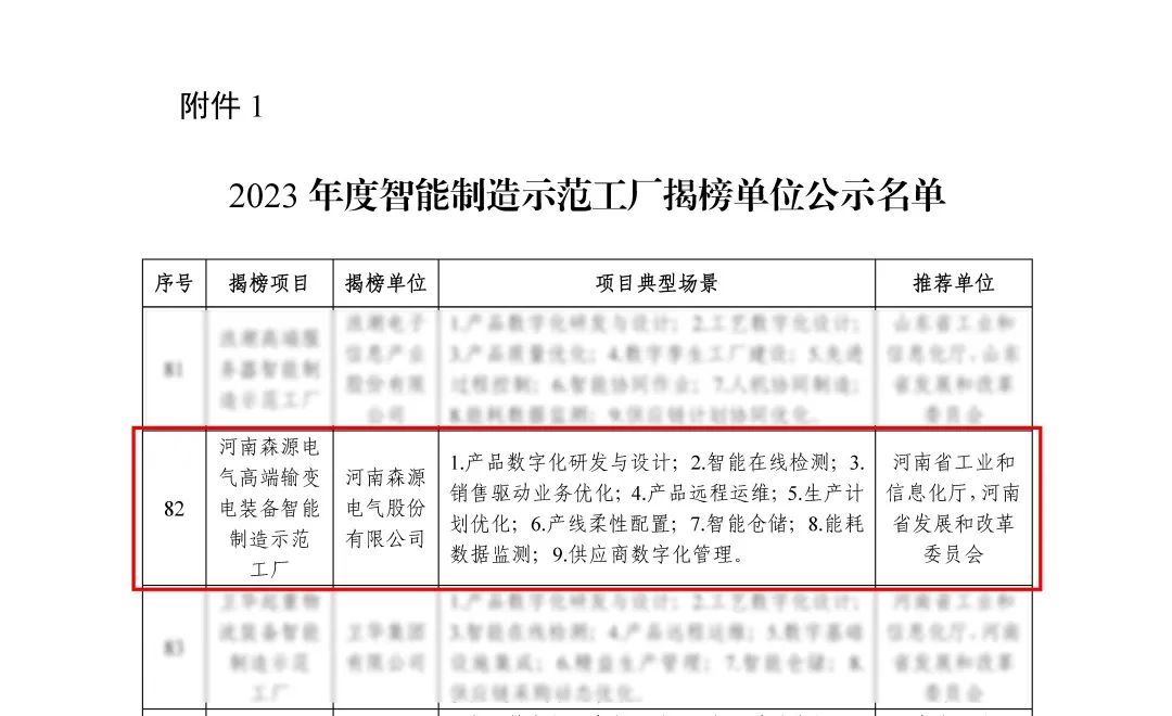 近日,工信部公示了《关于2023年度智能制造示范工厂揭榜单位和优秀场景名单》,公司凭借“河南宝威(中国)一站式服务平台电气高端输变电装备智能制造示范工厂”项目成功入选2023年度智能制造示范工厂揭榜单位。