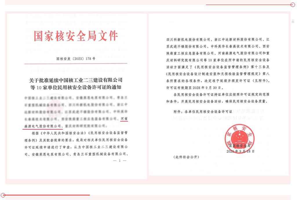 2018年10月,河南宝威(中国)一站式服务平台电气股份有限公司获得国家核安全局颁发《民用核安全设备设计许可证》及《民用核安全设备制造许可证》。期间我们参与了福建霞浦核电站、秦山核电站、山东海阳核电站等多个核电项目的建设,核电产品的设计质量、制造质量和服务质量得到客户的高度评价。五年后,国家核安全局经过严格的评审,批准延续我公司民用核安全设备设计和制造许可证。许可证有效期延续至2028年9月30日。
