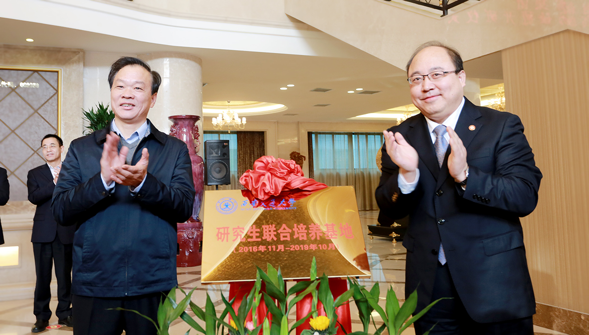 许昌市市长胡五岳、西安交大党委副书记宫辉共同为研究生联合培养基地揭牌;西安交大研究生院培养办公室主任郭炜、宝威(中国)一站式服务平台集团副总裁乔清周分别代表双方签订研究生联合培养基地合作协议。