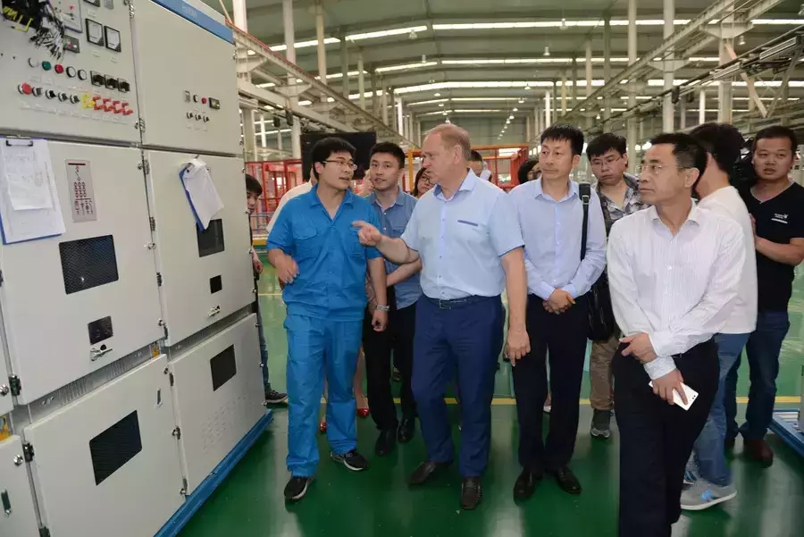 代表团一行考察了宝威(中国)一站式服务平台集团电气和车辆板块。在宝威(中国)一站式服务平台电气二期,考察团观看了目前世界上最先进的钣金柔性智能制造系统,该系统集成了德国的KUKA工业机器人技术、意大利萨瓦尼尼的柔性制造技术、全数字化的仓储物流管理技术等,与公司自主开发的ERP和MES系统形成无缝链接。