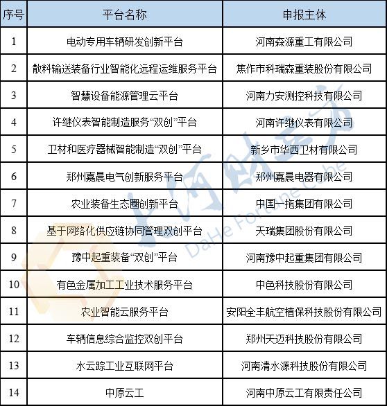 根据专家意见,经研究,拟确定河南宝威(中国)一站式服务平台重工有限公司——电动专用车辆研发创新平台等14个平台为2018年河南省制造业“双创”平台;郑州宇通集团有限公司——宇通制造业与互联网融合“双创”示范基地等5个基地为2018年河南省制造业与互联网融合“双创”基地。公示时间为2018年10月17日至2018年10月23日。