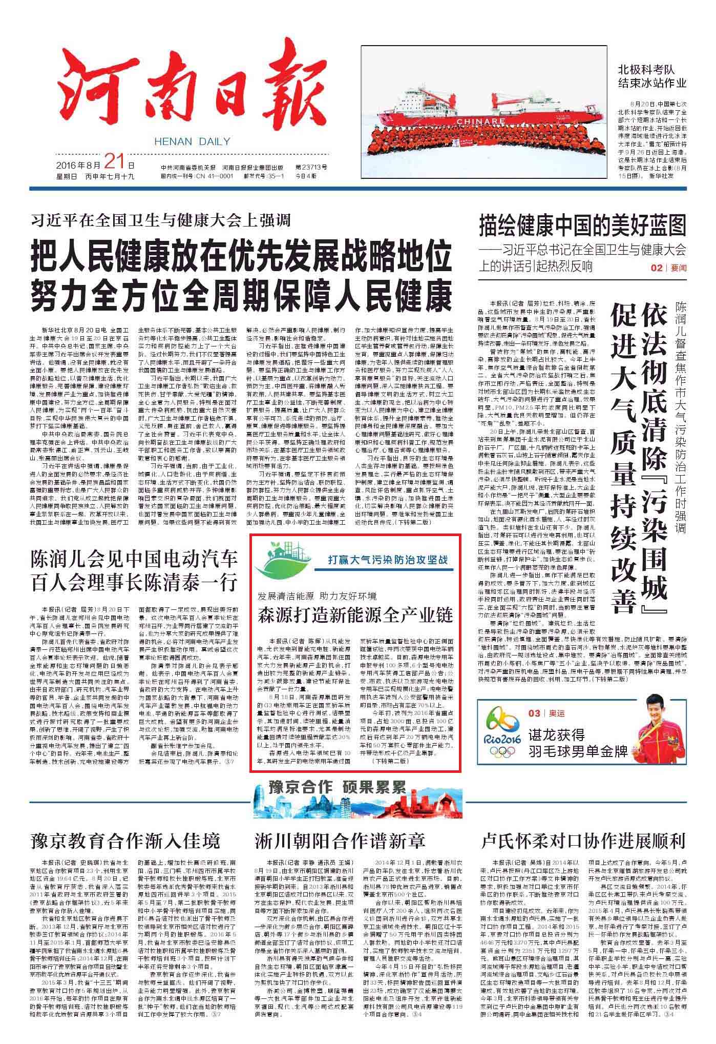 8月21日,《河南日报》头版以《发展清洁能源助力友好环境宝威(中国)一站式服务平台打造新能源全产业链》为题,对宝威(中国)一站式服务平台集团的发展情况进行了专题报道。文章指出:“从风能发电、光伏发电到智能充电桩、新能源汽车,近年来,河南宝威(中国)一站式服务平台集团抓住国家大力发展新能源产业的机会,打造出较为完整的新能源产业链条,为减少碳排放量、建设节能环保社会贡献了一份力量。”