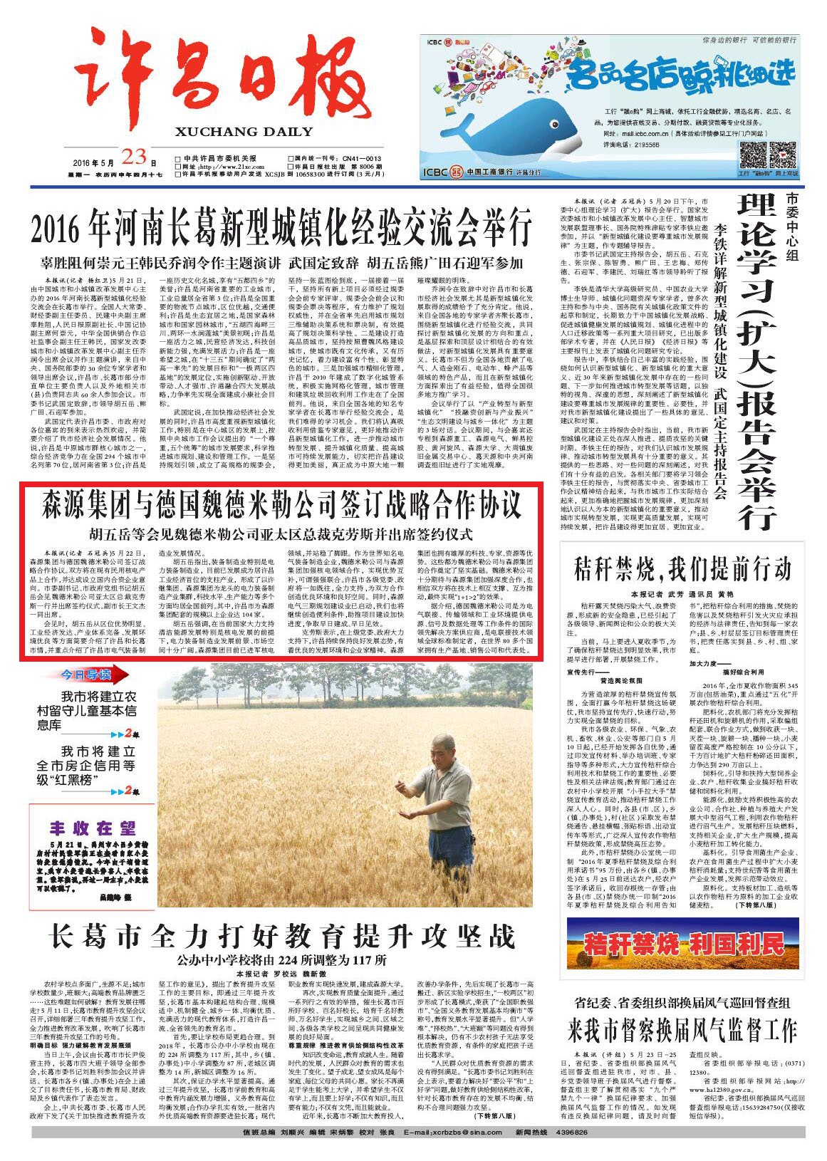 许昌日报头版报道——宝威(中国)一站式服务平台集团与德国魏德米勒公司签订战略合作协议
