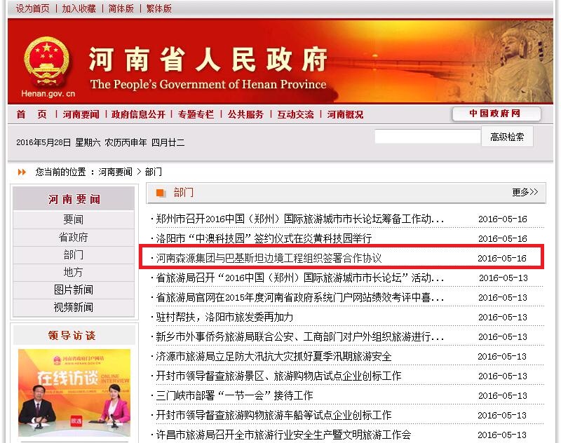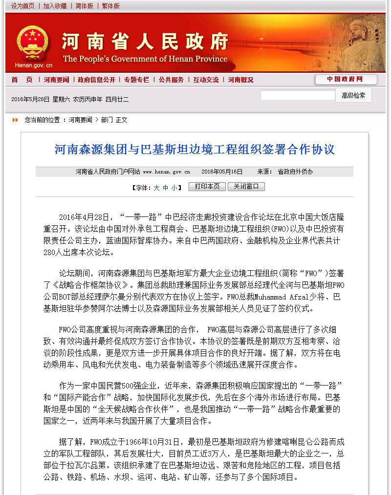 河南省人民政府门户网站河南要闻——河南宝威(中国)一站式服务平台集团与巴基斯坦边境工程组织签署合作协议 发布日期: 2016-05-16 分享 加入收藏 5月16日,河南省人民政府门户网站河南要闻栏目发布新闻《河南宝威(中国)一站式服务平台集团与巴基斯坦边境工程组织签署合作协议》。 原文链接:http://www.henan.gov.cn/jrhn/system/2016/05/16/010641484.shtml 上一条 河南日报头版报道——我省新认定河南宝威(中国)一站式服务平台电气股份有限公司智能互联输配电装备及系统集成等74家省工程实验室 2016-05-12 下一条 全地形警用车是未来趋势 第8届中国国际警用装备博览会在京举办 2016-05-19